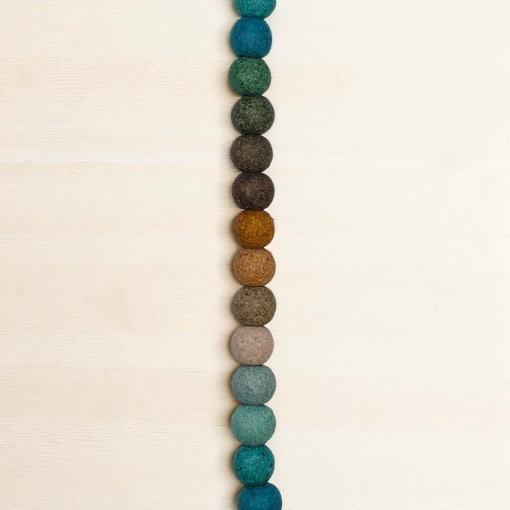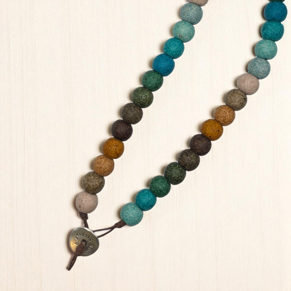 Each clay bead is individually crafted and hand-painted in a soothing ombré of turquoise tones — from pale seafoam to deep ocean blue — reflecting the shimmering waters and clear coastal skies. Strung on a supple faux leather cord, it balances natural texture with contemporary style.