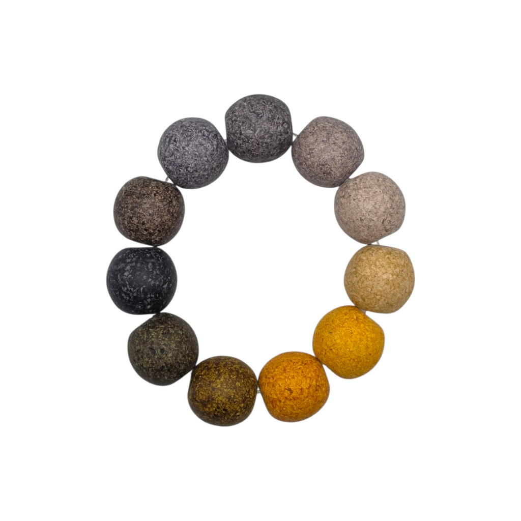 Each clay bead is shaped and hand-painted in a joyful ombré of yellow tones — from soft lemon to deep golden amber — creating a vibrant, sun-kissed finish. Strung on a flexible elastic cord, it offers both comfort and effortless elegance, perfect for everyday wear.