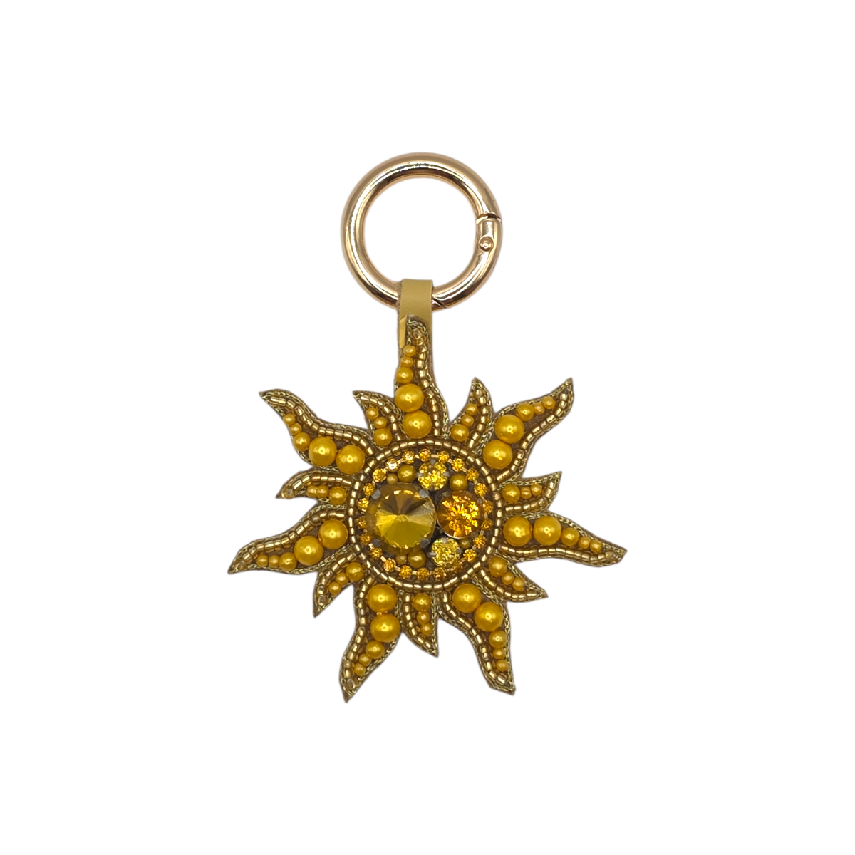 Brighten up your accessories with the Golden Sun Beaded Bag Charm. Designed in a radiant sunburst silhouette, this charm features rich golden beads and sparkling crystal accents arranged around a glowing centre for a warm, eye-catching finish. The intricate beading and gold-tone hardware add a luxe touch, while the sturdy clasp makes it easy to attach to handbags, totes, or keys. Bold yet elegant, this charm brings a little sunshine wherever you go.