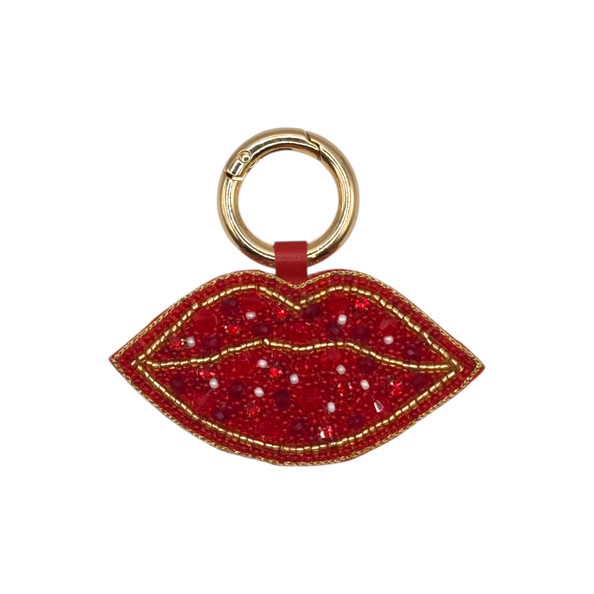 Add a playful pop of personality to your favourite bag with this Red Lips Beaded Bag Charm. Designed in a bold lip silhouette, it features rich red beading with subtle sparkle, accented by delicate gold detailing for a luxe finish. The polished gold-tone clasp makes it easy to attach to handbags, totes, or keyrings, instantly elevating your everyday accessories. Fun, flirty, and eye-catching, this charm is the perfect statement piece or gift for anyone who loves standout style.
