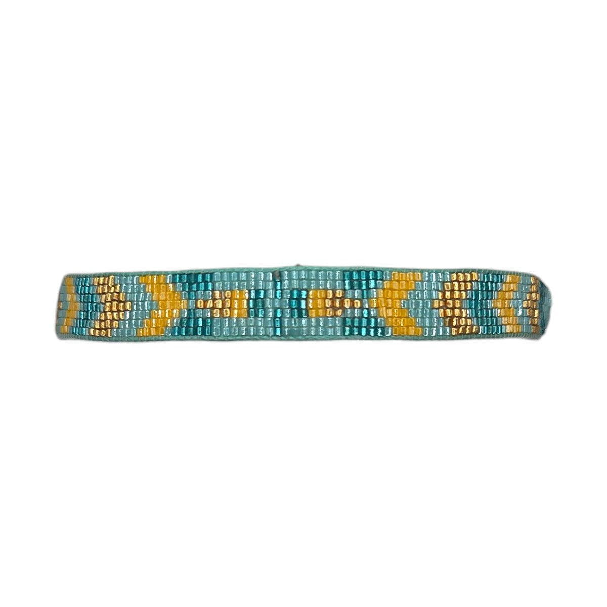 Add a bold pop of colour and pattern to your wrist with the Aqua & Lemon Beaded Arrow Bracelet. Featuring a striking arrow motif woven from aqua and lemon-hued beads with subtle gold accents, this bracelet brings a modern, handcrafted feel to any look. The wide beaded design makes it a standout piece worn alone or layered with your favourite bracelets. Bright, playful, and effortlessly stylish, it’s perfect for everyday wear or sunny getaways.