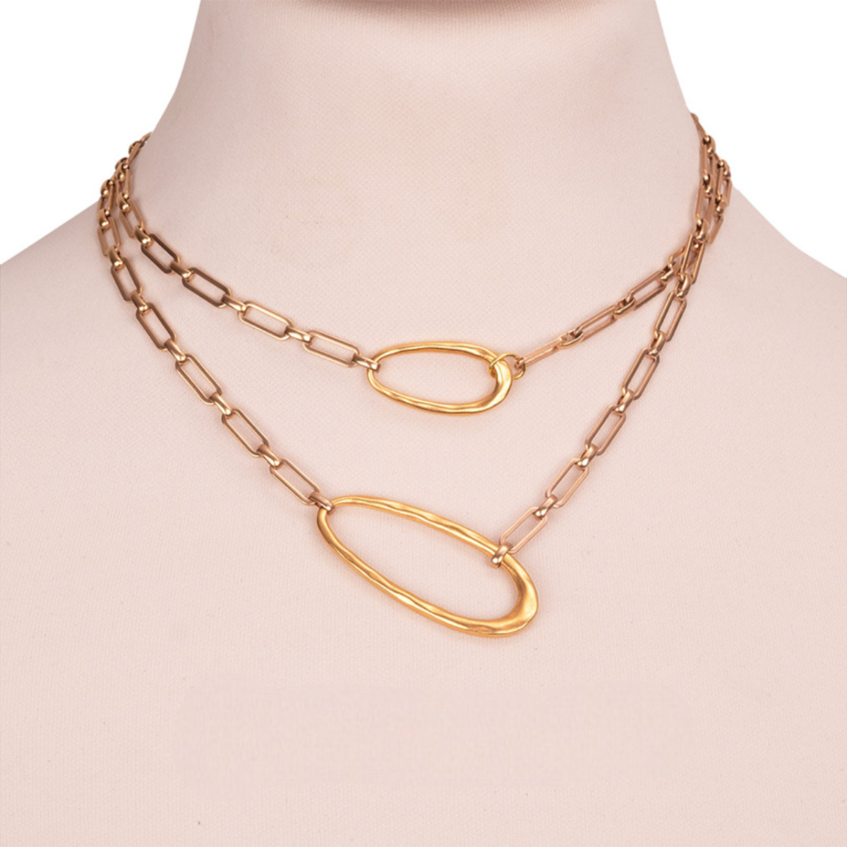 This double-layer necklace pairs a contemporary paperclip chain with organic oval links, crafted in plated bronze for a lightweight yet distinctive finish.