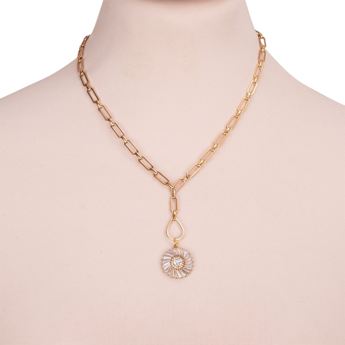 This necklace features a contemporary paperclip chain, accented with a teardrop link and a crystal-set deco circle pendant for a light-catching finish.