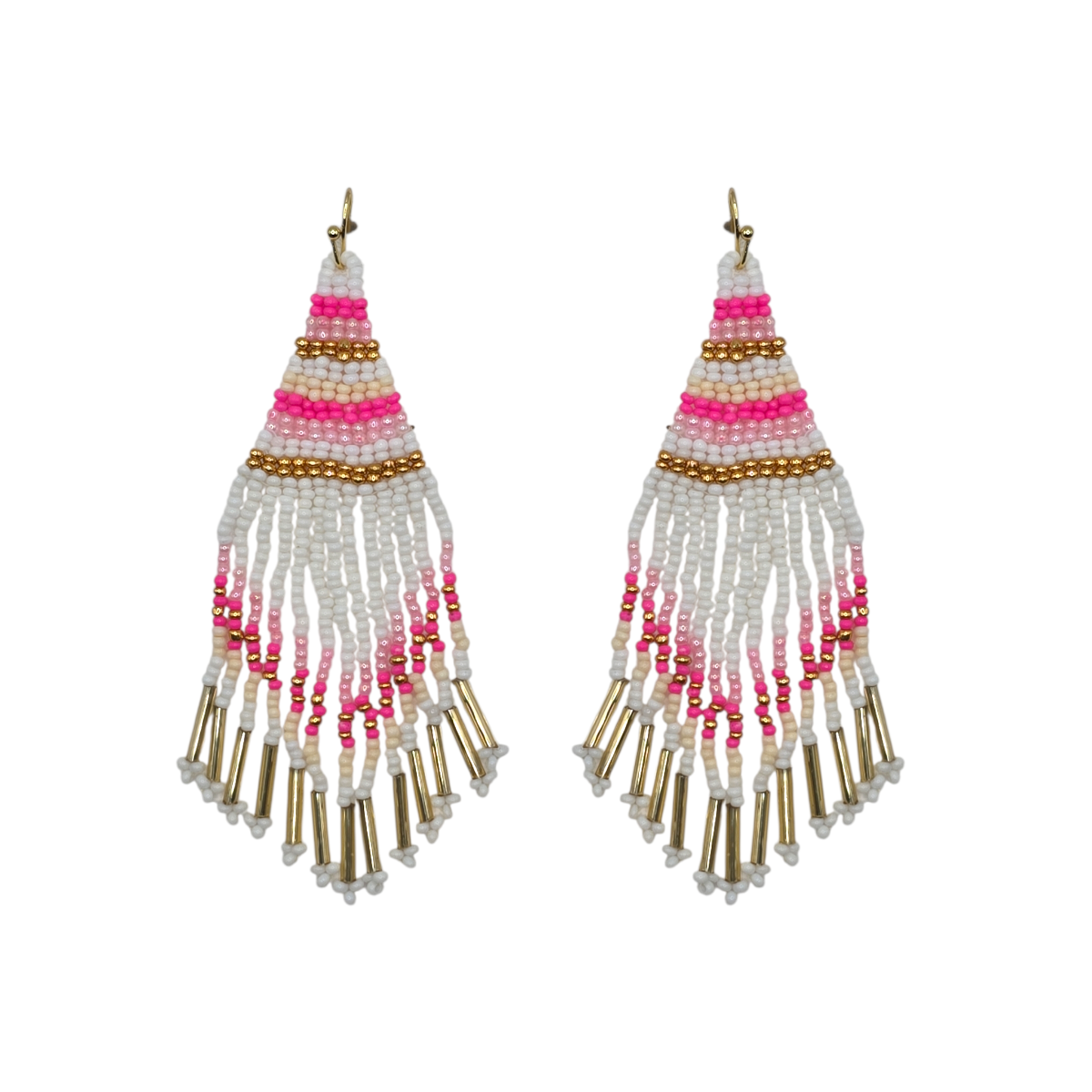 Soft, feminine, and beautifully detailed, the Beaded Pink & White Ombre Tassel Hook Earrings feature delicate hand-beaded strands that flow from a layered ombre pyramid design. Shades of white, blush, and vibrant pink are accented with subtle gold beadwork and finished with elegant gold tube tips for movement and shine. Lightweight with graceful tassel swing, these earrings add a romantic pop of colour to both casual and dressy looks.