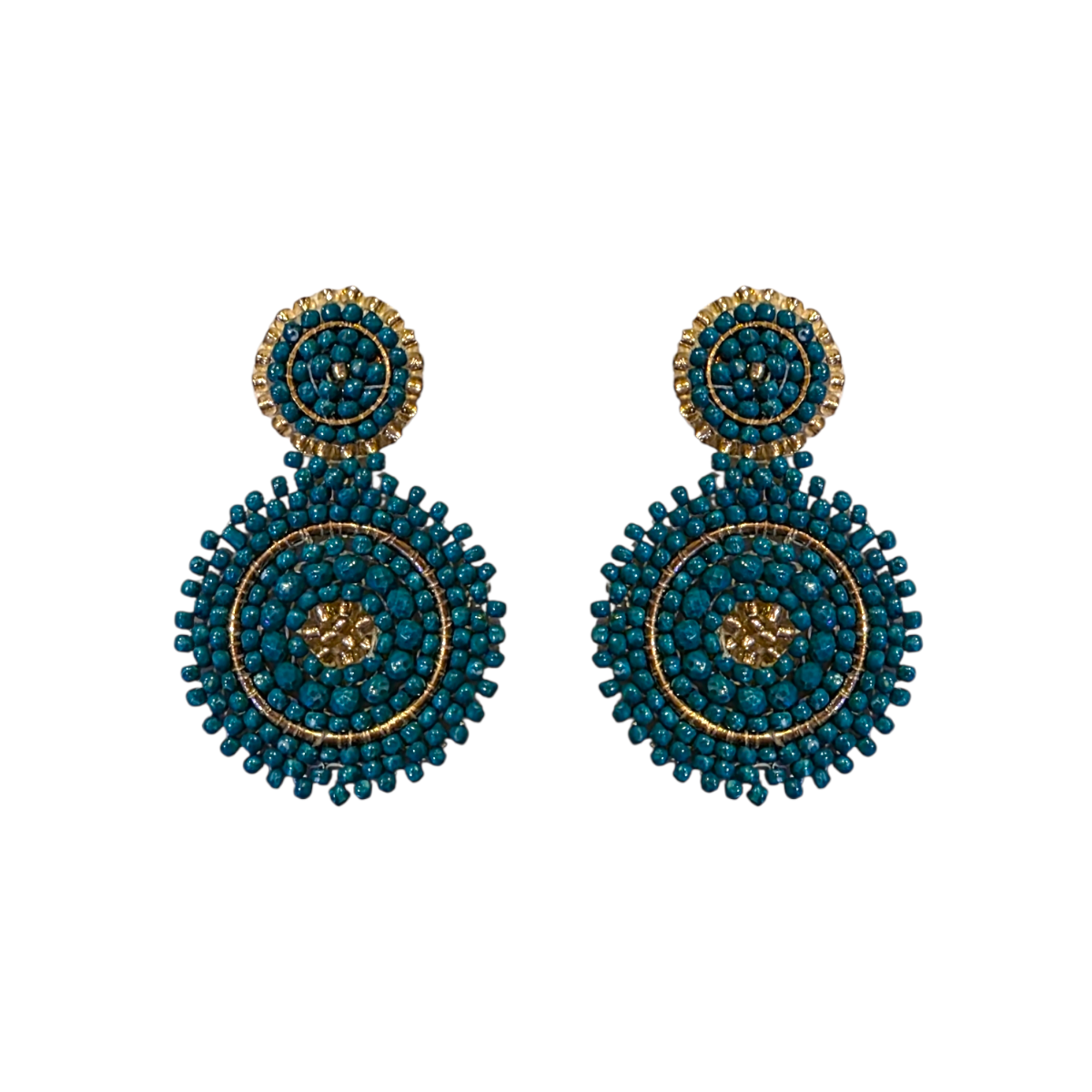 Rich, vibrant, and beautifully detailed, the Mini Teal Mix Beaded Circle Drop Earrings are a striking blend of colour and craftsmanship. Handcrafted with layered teal beadwork in varied tones, these earrings feature delicate gold accents and a softly textured centre that adds warmth and dimension. The raised, beaded edge creates a subtle halo effect, giving the design depth while keeping the silhouette refined and lightweight.