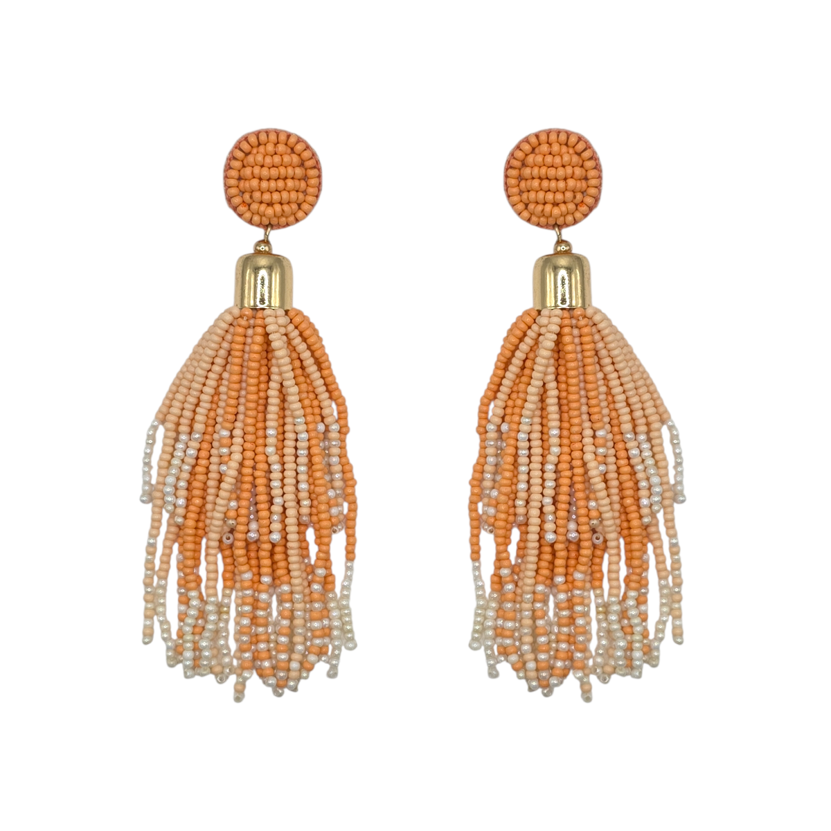 Add soft warmth and effortless elegance to your look with the Peach & Ivory Mix Tassel Earrings. Featuring textured beaded studs and cascading tassels in blended shades of peach and ivory, these earrings offer beautiful movement and a delicate, feminine finish. Subtle gold-tone accents complete the design, making them perfect for both everyday wear and special occasions. Lightweight and versatile, they bring a polished touch to any outfit.