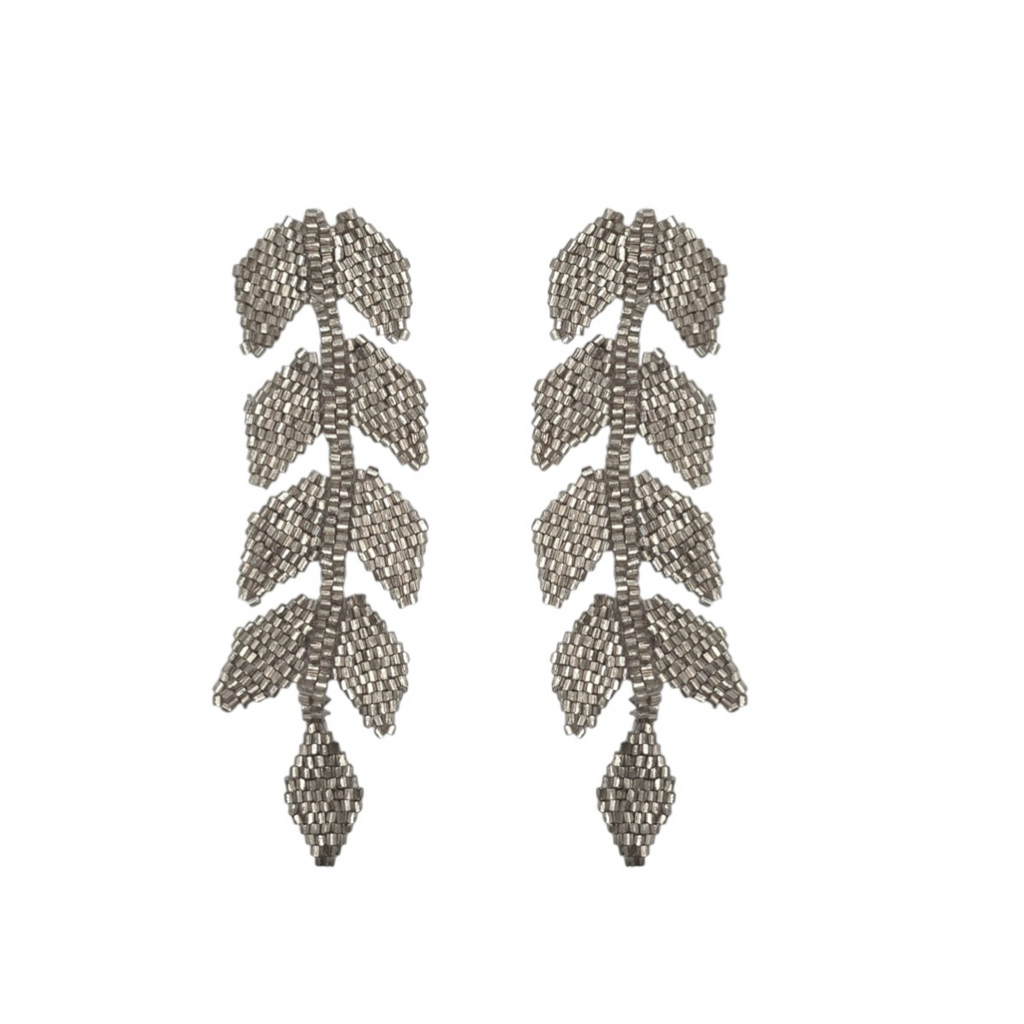 ring a touch of elegance and natural beauty to your look with our Silver Shimmer Beaded Leaf Drop Earrings. Handcrafted with metallic silver seed beads, these cascading earrings feature a striking leaf-inspired design that catches the light beautifully with every movement.