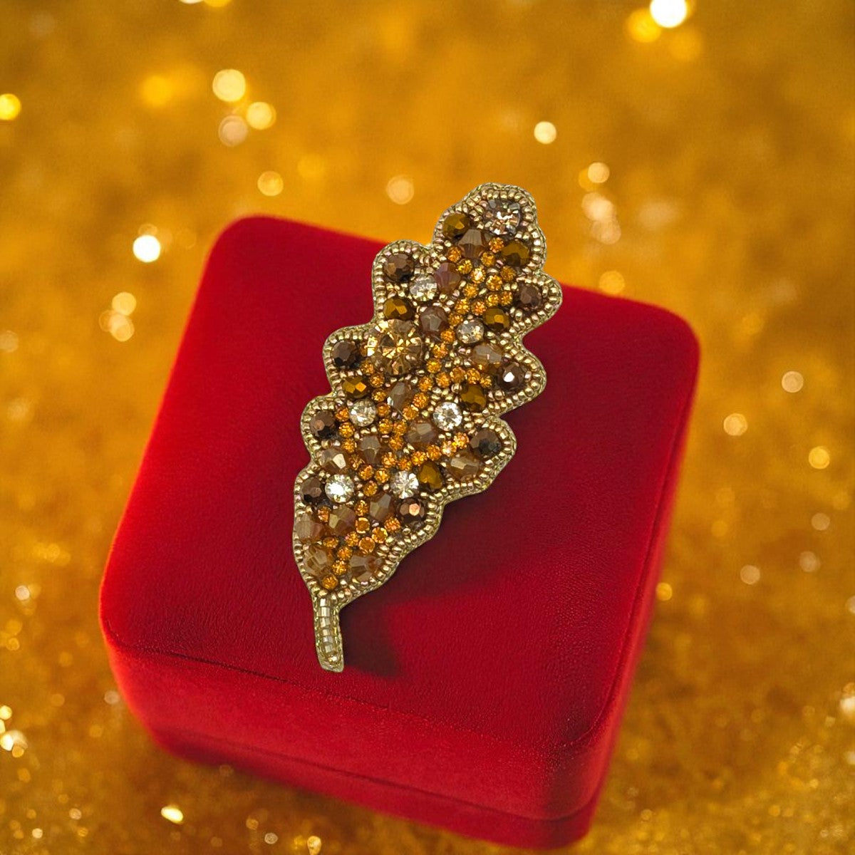 Inspired by the strength and elegance of the oak, this brooch is hand-embroidered in rich brown ombré tones with a touch of golden sparkle. Crafted by skilled artisans in India, it blends traditional embroidery techniques with a modern design aesthetic.