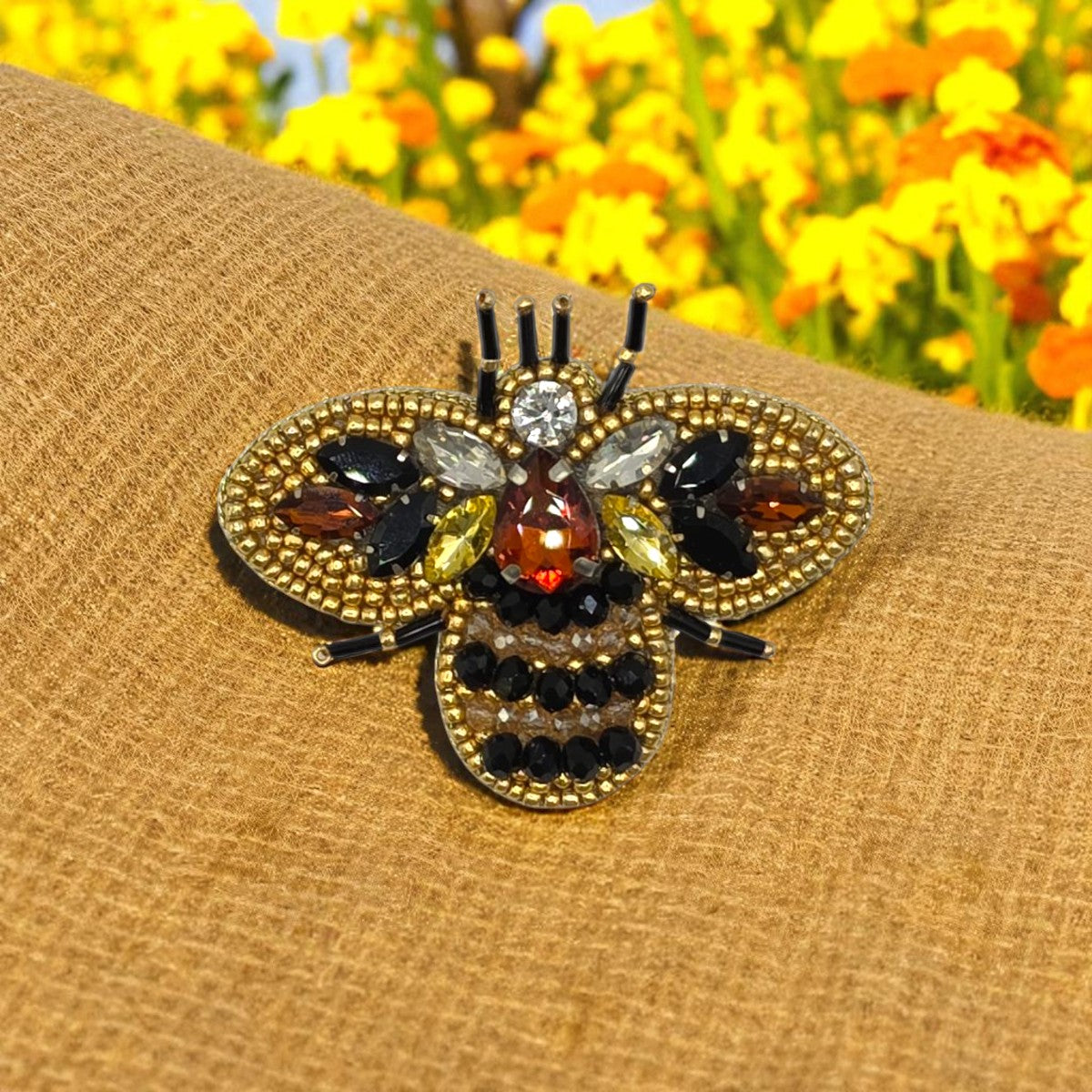 Glowing in warm golden and brown ombré tones, this embroidered bee brooch captures both elegance and vitality. Hand-stitched with fine detail and subtle sparkle, it reflects the artistry of Indian craftsmanship while bringing a modern, nature-inspired charm.