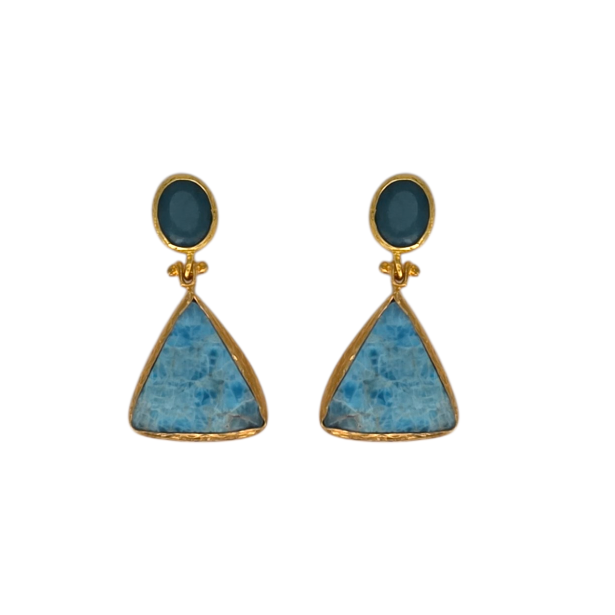 The cool blue tones evoke the colours of clear tropical waters, while the angular pyramid cut gives the earrings a contemporary, sculptural feel. Set in warm gold tones, the stones are beautifully framed to highlight their natural patterns and luminous colour.