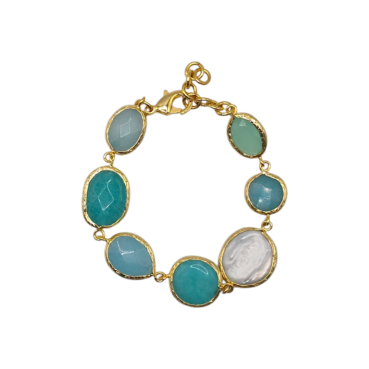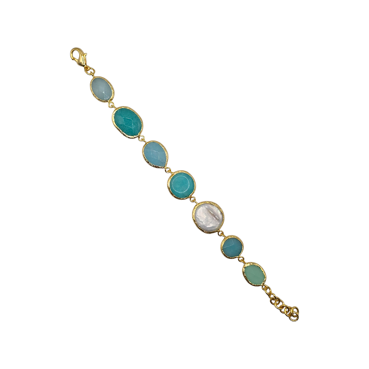 Each bracelet is handmade in Türkiye using natural stones set in a brass base with flash gold plating. Due to the natural characteristics of chalcedony and pearl, each piece will vary slightly in colour, tone, and pattern, making every bracelet unique.