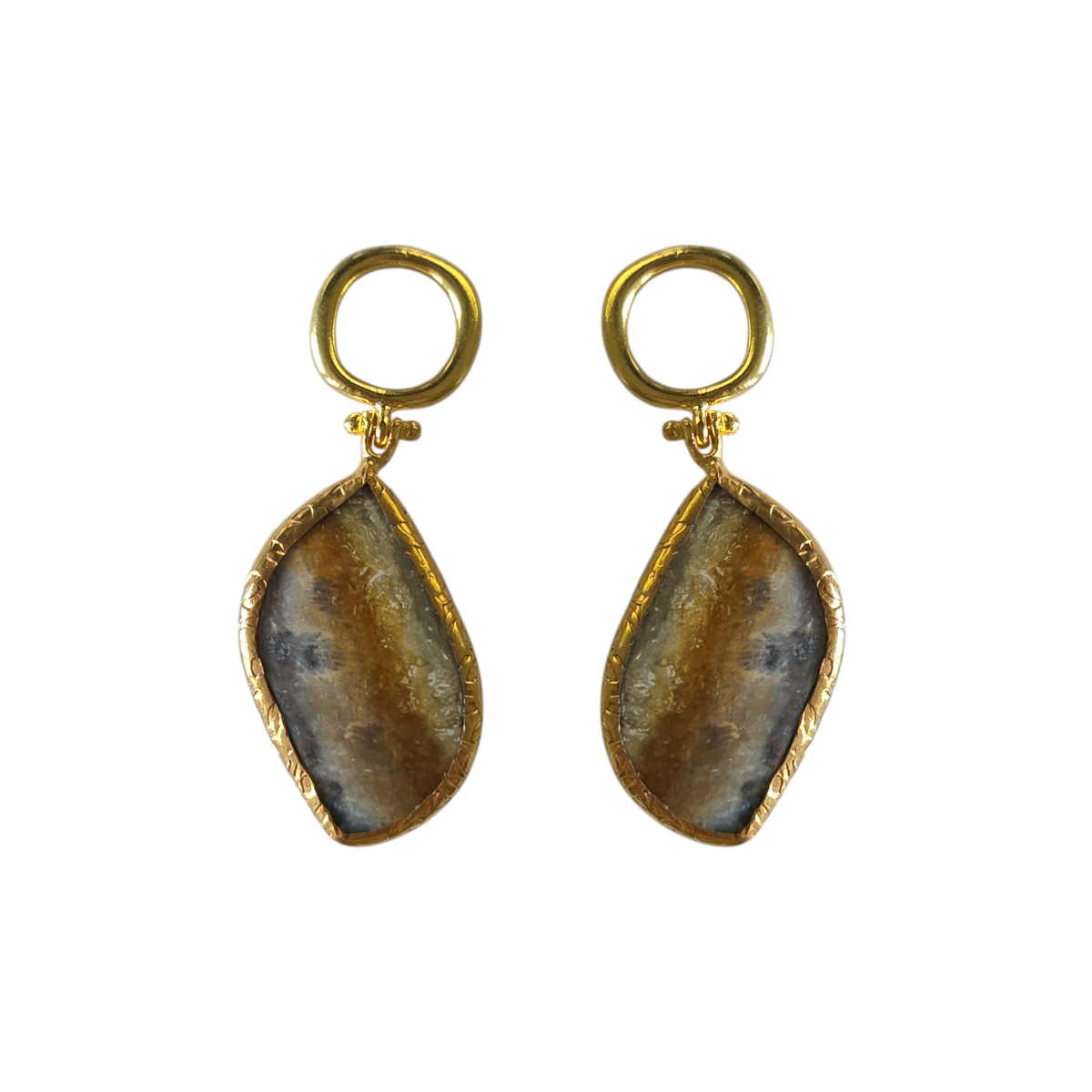 Earthy and beautifully organic, the Desert Quartz Slice Drop Earrings from The Jewel Edit showcase the raw, natural beauty of quartz in a striking sculptural design. Suspended from smooth gold circular studs, each earring features an irregular slice of desert-toned quartz with warm amber, honey, and smoky grey hues flowing through the stone.