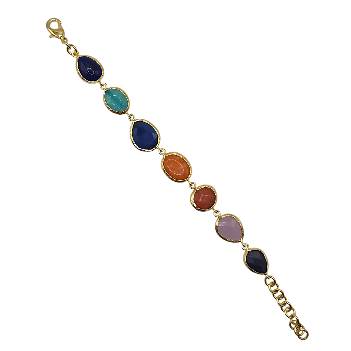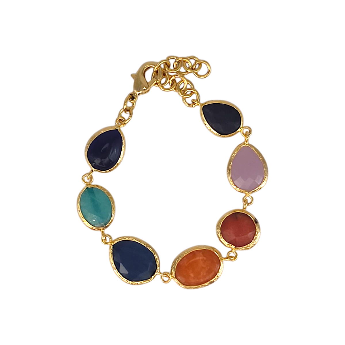Each stone is individually framed in warm gold tones, allowing the natural colours and faceted surfaces to catch the light beautifully as the bracelet moves.
