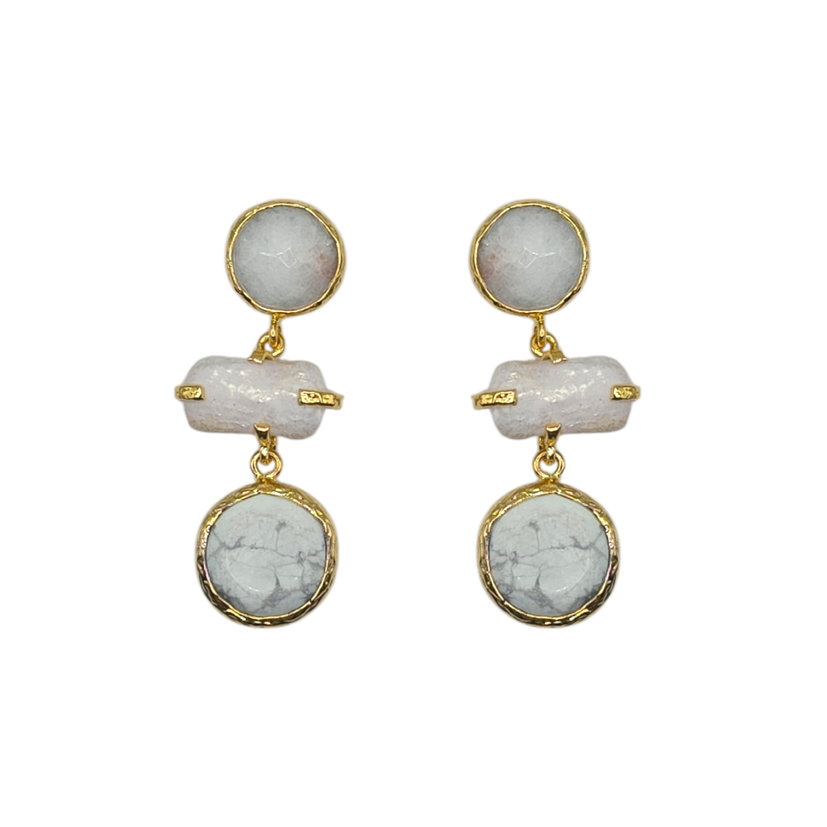 The soft, luminous tones of the moonstone and pearl contrast elegantly with the subtle veining of the lower stone, giving the earrings depth and character. Their balanced proportions create gentle movement while remaining comfortable and wearable.