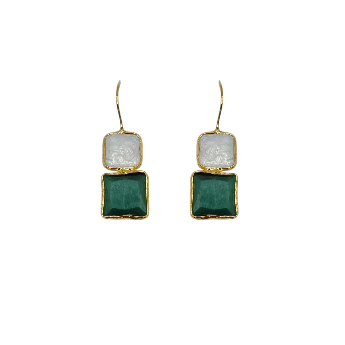 Elegant and contemporary, the Pearl & Green Quartz Double Square Hook Earrings from The Jewel Edit combine soft luminosity with rich gemstone colour in a beautifully balanced design.