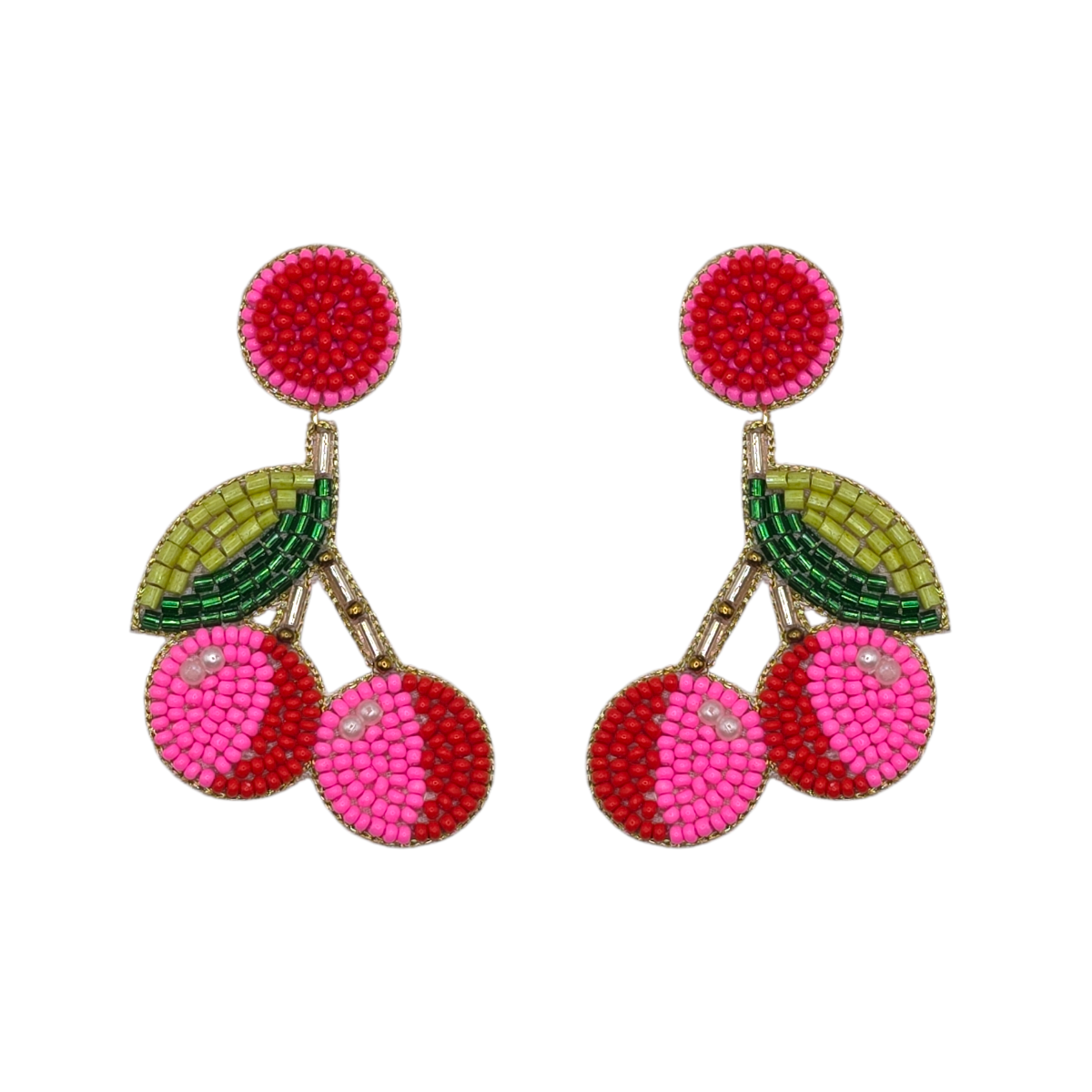 Add a playful pop of colour to your look with the Pink & Red Beaded Cherry Earrings. Featuring a charming cherry design, these earrings are crafted with vibrant pink and red beads, accented by rich green beaded leaves and delicate gold details. The lightweight drop silhouette offers comfortable wear while making a bold, cheerful statement. Perfect for summer outfits, brunch dates, or whenever you want to add a fun, fruity touch to your style.