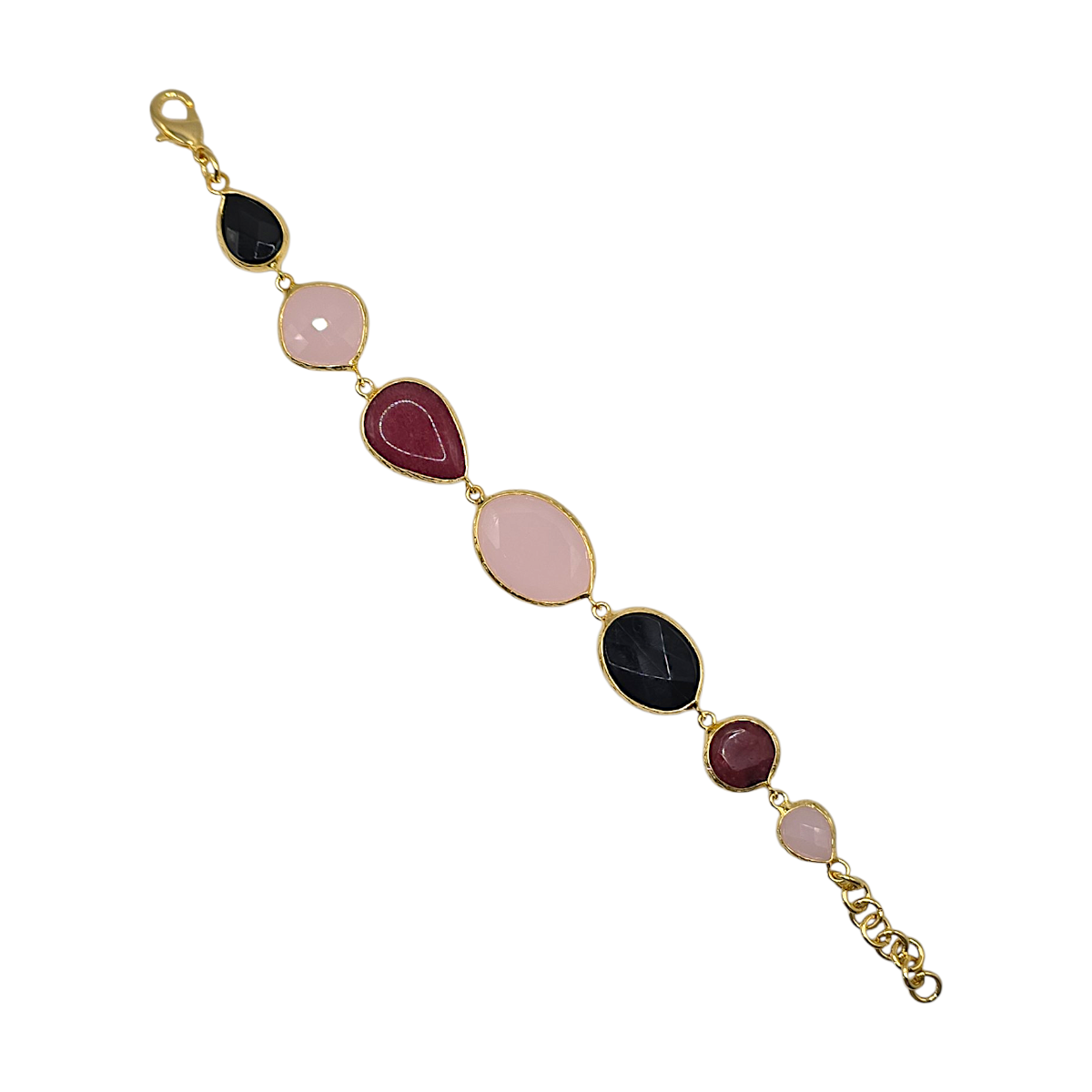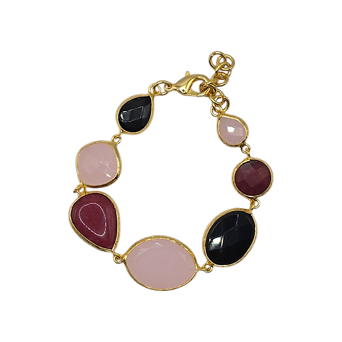 Soft rose quartz stones bring a delicate, feminine glow, while rich black onyx adds contrast and depth. Accents of deep rose-toned stones enhance the palette, giving the bracelet a sophisticated jewel-like quality. The varied shapes and sizes of the stones create an organic rhythm that feels both modern and elegant.
