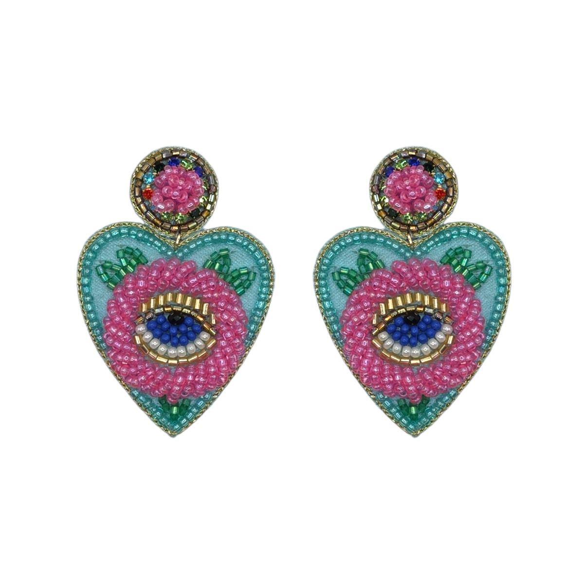 Make a bold, artistic statement with the Turquoise & Pink Eye Heart Earrings. Designed in a striking heart silhouette, these earrings feature vibrant turquoise beading accented with soft pink details and a captivating eye motif at the centre. Pops of green, blue, and gold add depth and texture, creating a rich, dimensional look. Lightweight yet eye-catching, these earrings are perfect for elevating both casual and dressed-up outfits with a touch of playful, bohemian flair.